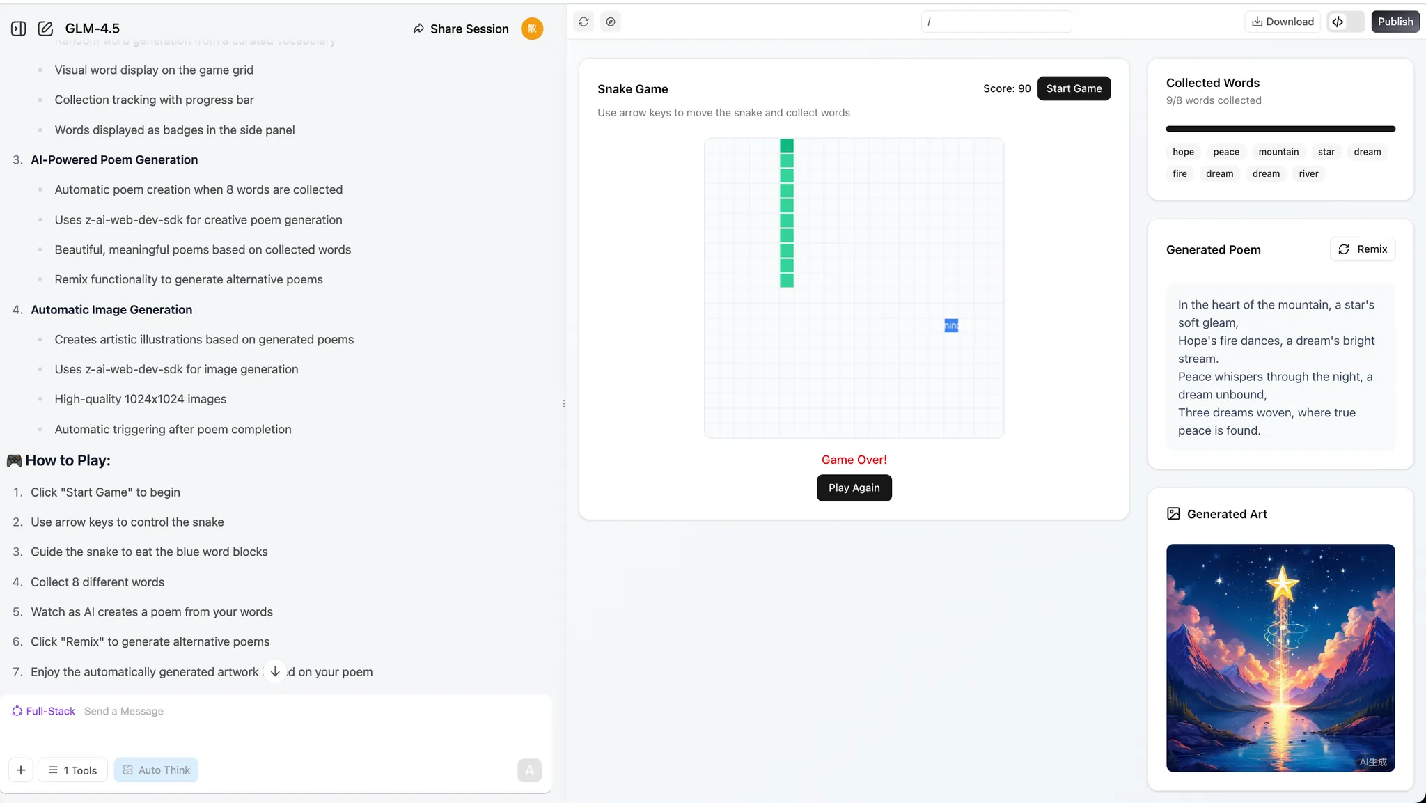 每当蛇吃掉一个单词,LLM 会对该单词进行诗意联想(例如,“树”→“森林”、“绿荫”),图像模型会即时为该单词生成一个小艺术品。这些图像逐渐拼凑成一个独特的、玩家创造的全景图,所以玩家每次游玩都在“作画和写诗”。