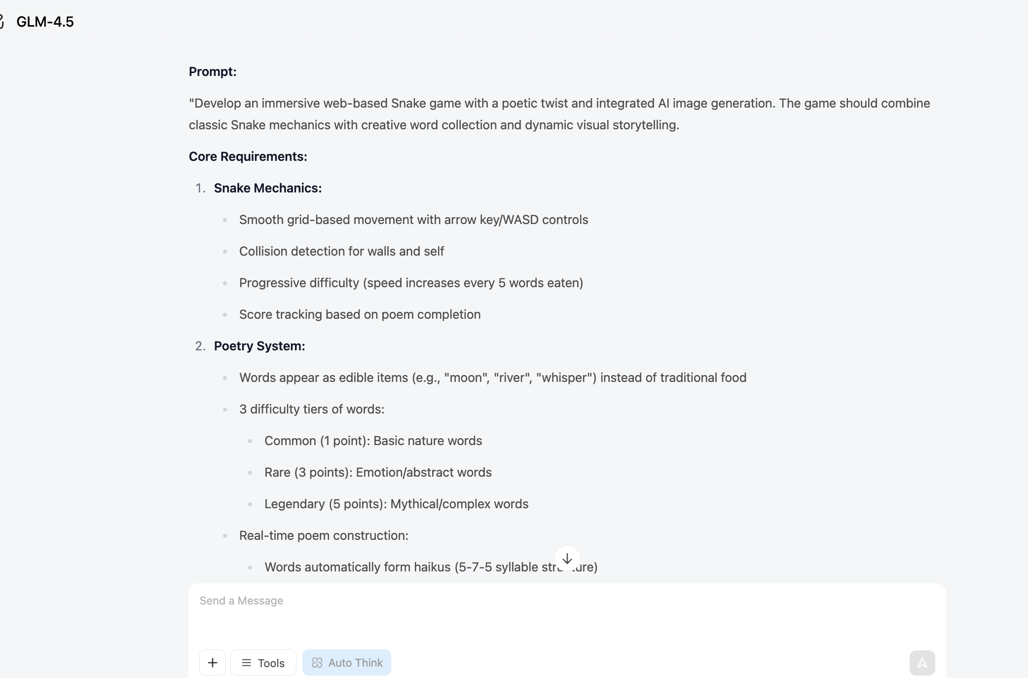 反向模式:LLM 给出一句诗或一个谜语,玩家必须引导蛇按顺序吃掉单词来重构句子。吃错单词会通过图像生成模型触发有趣或艺术性的后果。