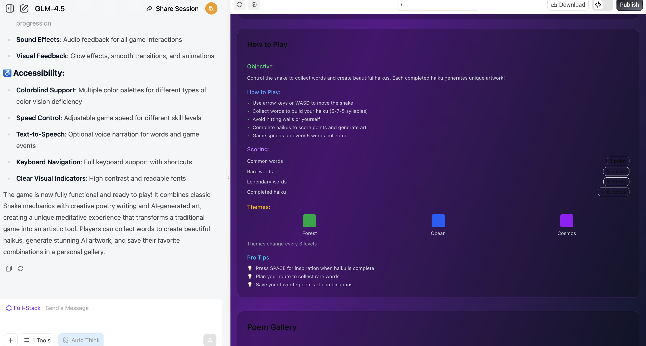 💡 示例提示词: 帮我做一个贪吃蛇游戏,它应该支持: