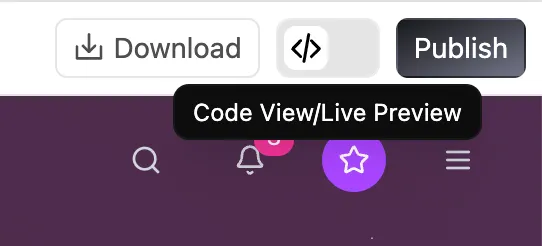 其中顶部从左到右按钮的作用依次为:箭头按钮展开侧边对话历史栏,铅笔按钮用于新建一个对话,循环箭头按钮用于刷新页面,指南针按钮负责切换至全屏模式,Download 按钮用于下载项目,<> 按钮用于切换代码视图,Publish 按钮用于发布项目。
