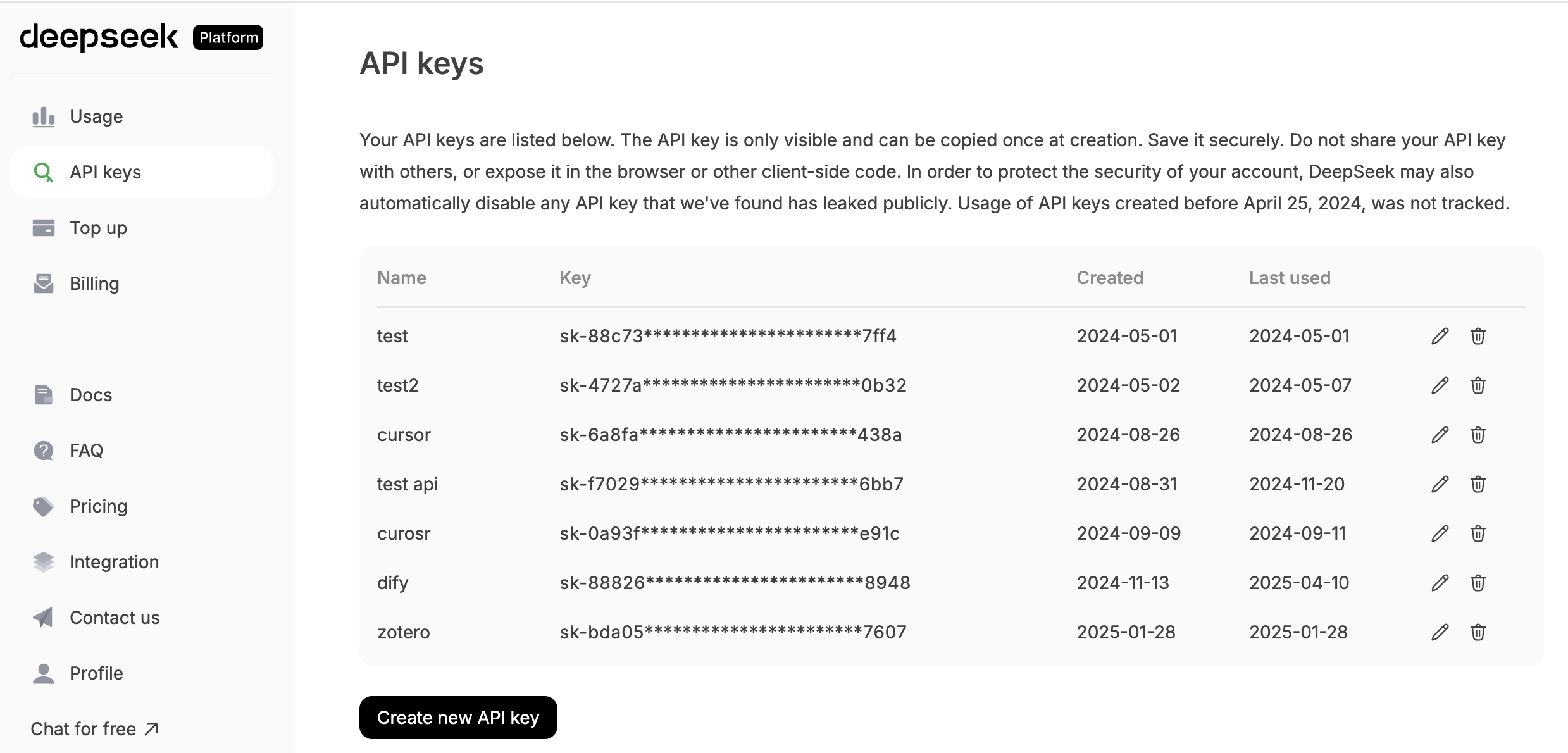 接下来我们进行演示,你可以跟随操作走一遍全流程。首先注册 DeepSeek 账号并创建一个 API Key,并且充值少量费用进行验证。