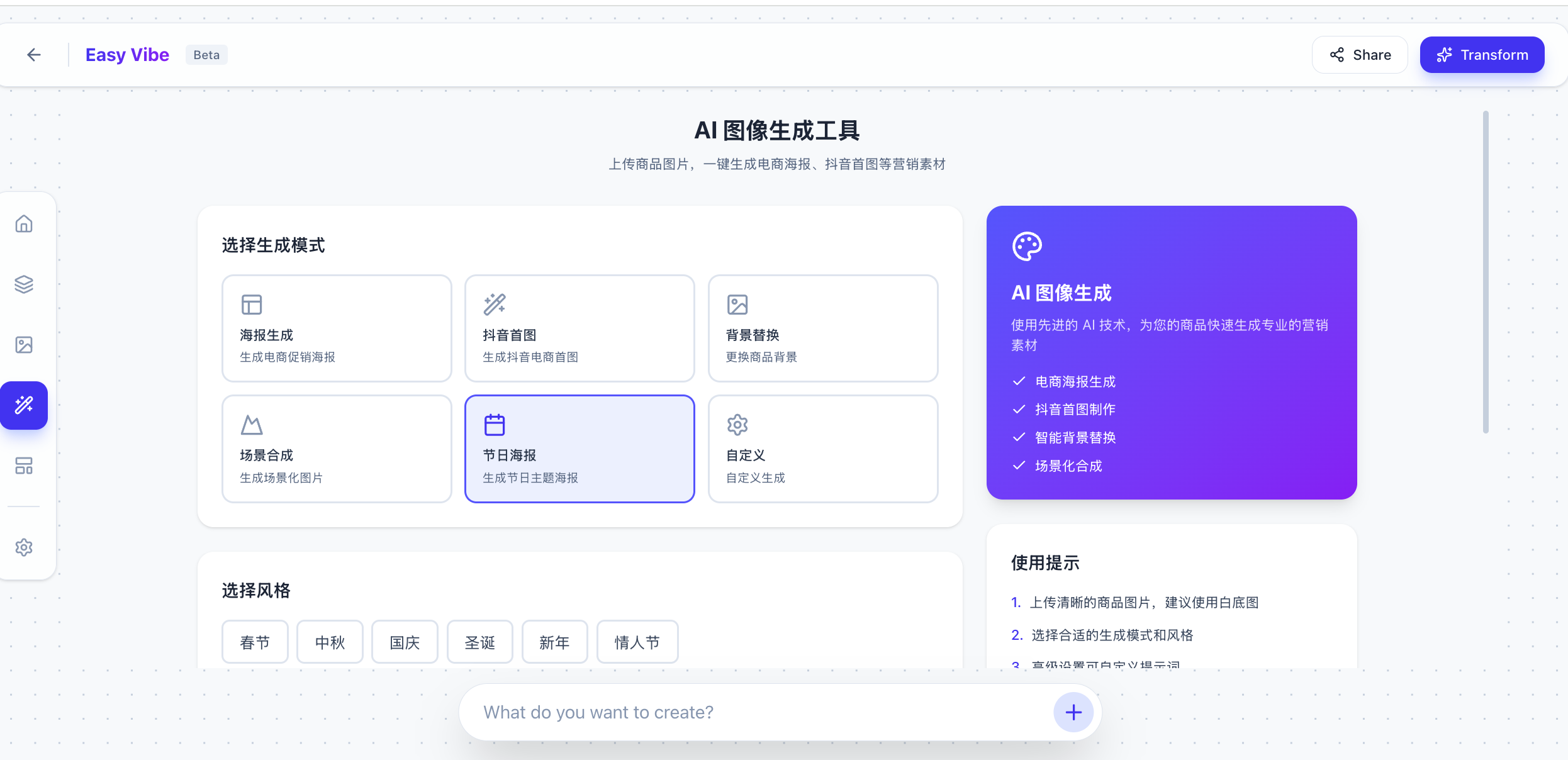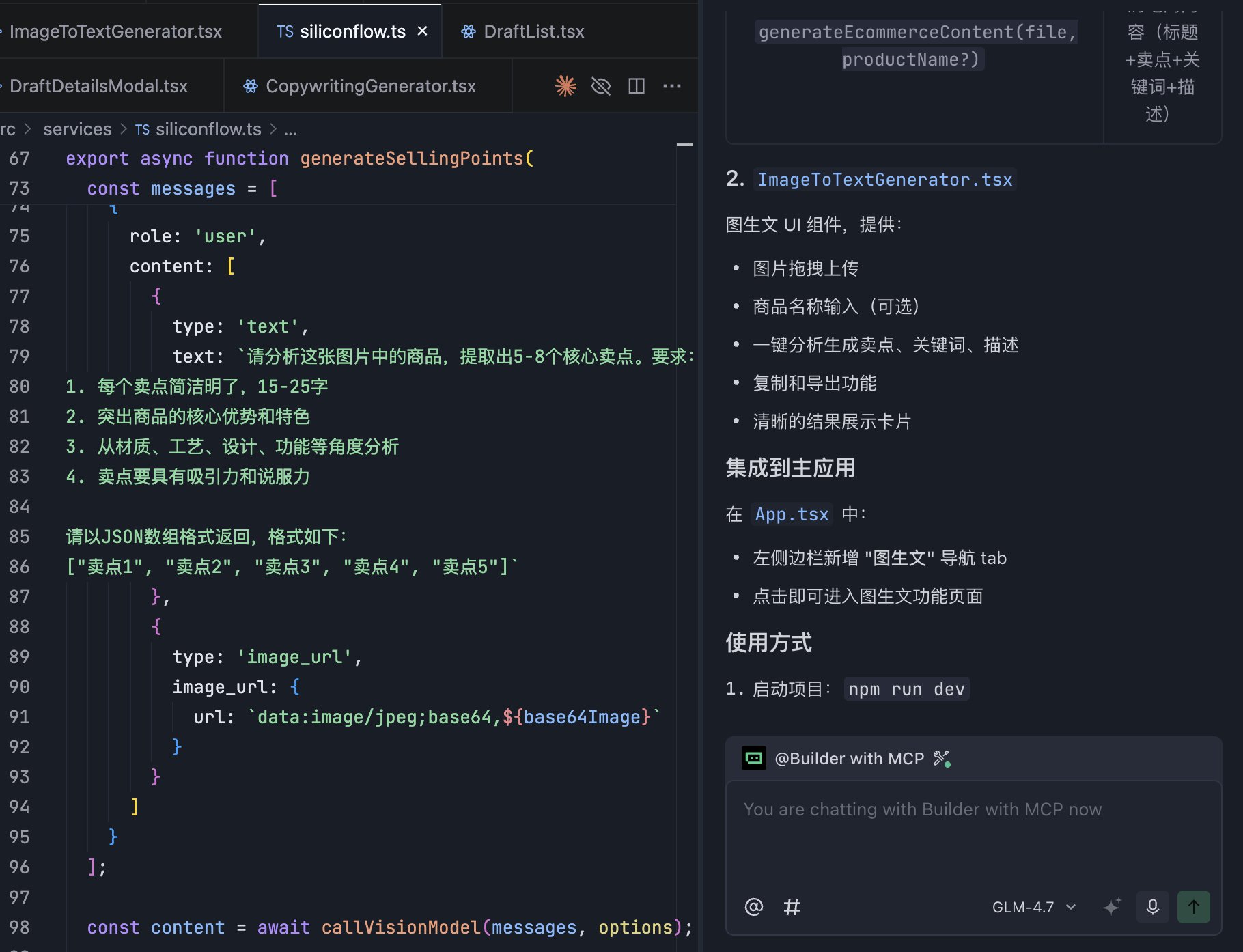 }'经过一段时间的 AI 代码生成,我们很容易得到对应的文案生成按钮进行测试,如果你找不到入口,可以让 AI IDE 告诉你从什么页面可以点到该页面,如果实在找不到,可以让 AI IDE 直接基于你的想法重构改进,得到最后的文案生成结果。