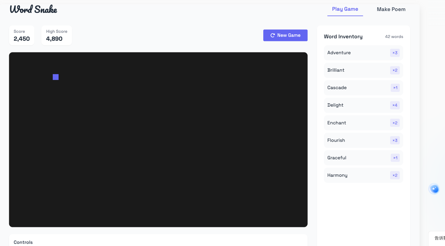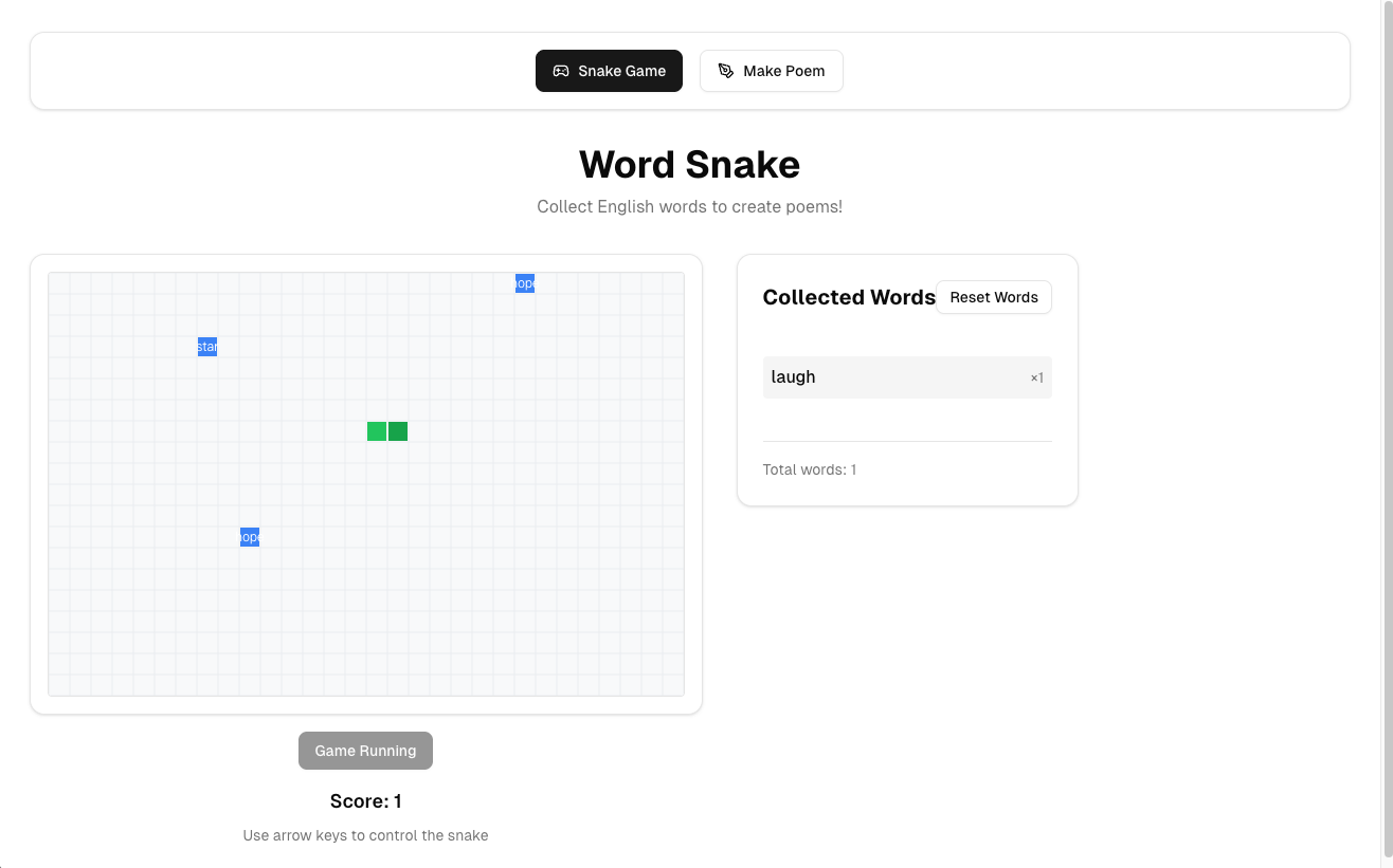 - 单词收集机制(单词出现在棋盘上,蛇吃掉单词后,侧栏列表更新)。