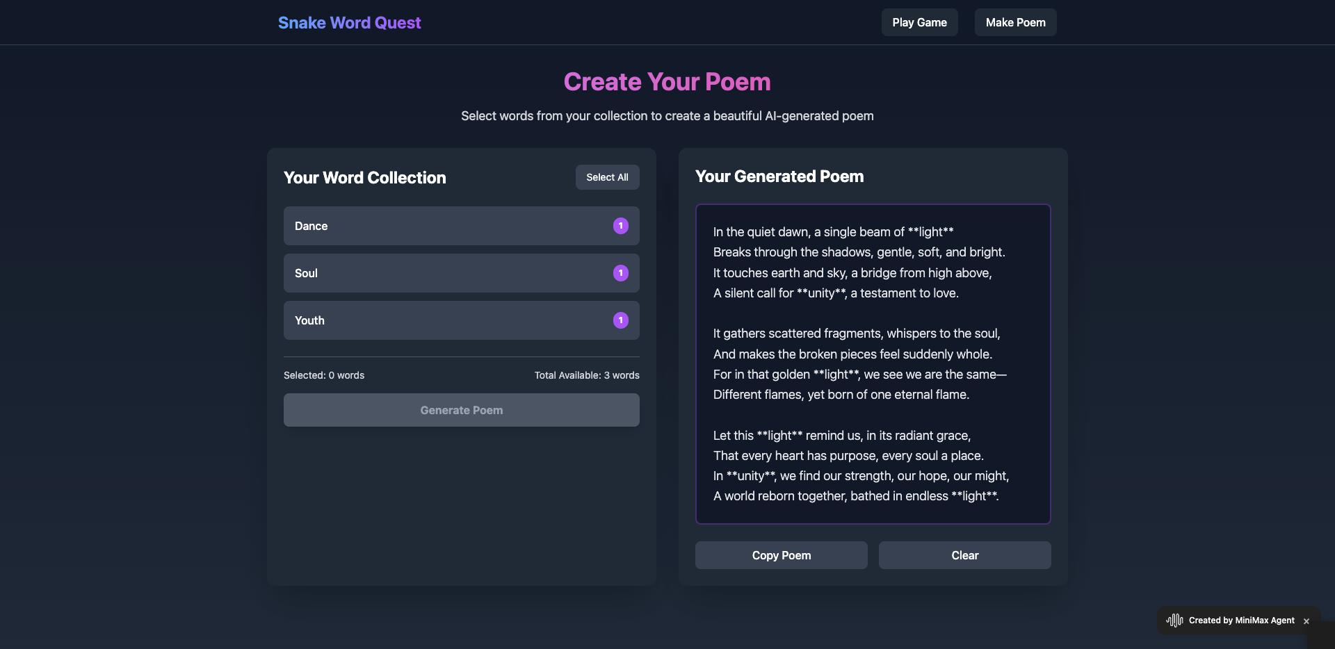 - 用户选择部分单词并点击 Generate Poem 按钮。
