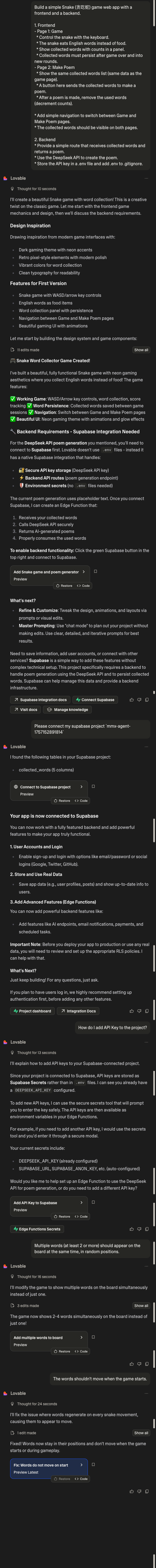 - 主要特性与工作流: Lovable 在集成与协作方面做得很好,它自动完成诸如连接 Supabase 数据库等初始化工作,使项目搭建过程非常顺畅。你只需描述项目需求,Agent 就会帮你把各类服务串联起来,构建好基本结构。