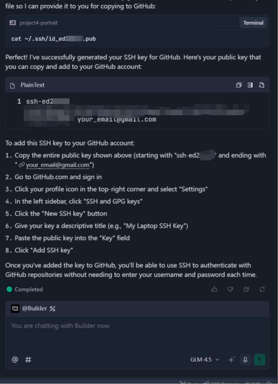 最后,你会看到右侧的 Trae 返回了它读取的公钥。你只需复制它并准备在下一步中粘贴。