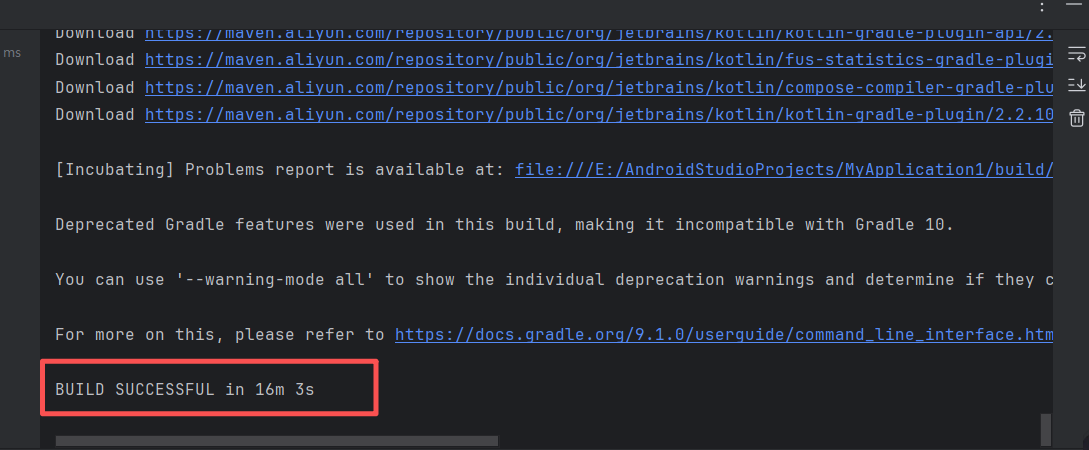 到了这一步我们记得保存一下,然后点击右上角的那个 Try Again,软件会重新开始下载配置。耐心等待几分钟,当底部控制台出现 BUILD SUCCESSFUL字样时,说明环境搭建彻底成功,我们已经准备好开始写代码了。