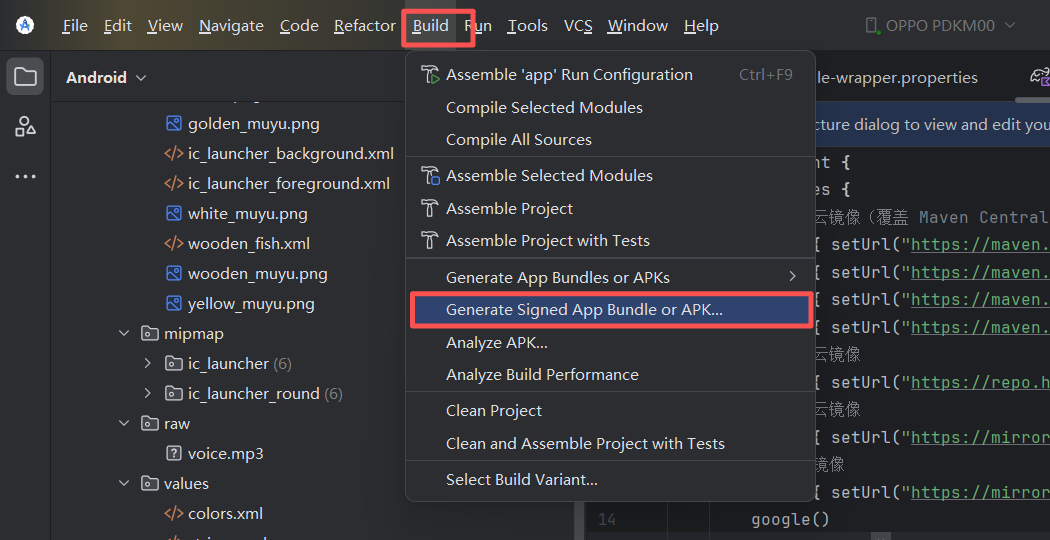 在顶部菜单栏选择 Build,这次我们要点击 Generate Signed Bundle / APK。 在弹出的窗口中,你会面临两个选择: